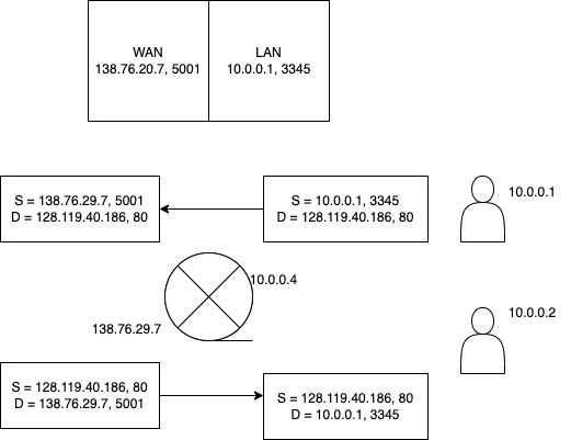 즉 라우터를 거친 주소는 출발지 S=10.0.0.1, 3345에서 S=138.76.29.7, 5001으로 변경한다.