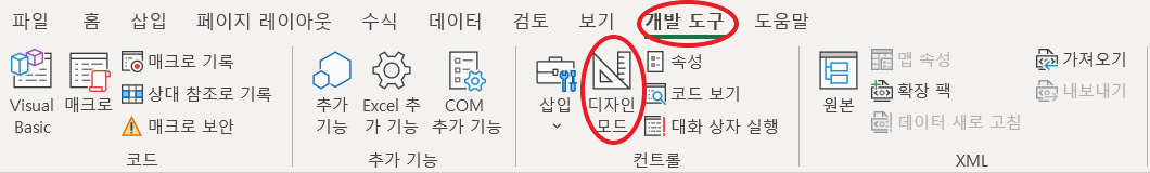 우선 프로시저 문제를 풀기 위해서는 [개발도구] - [디자인 모드]를
